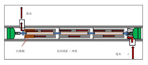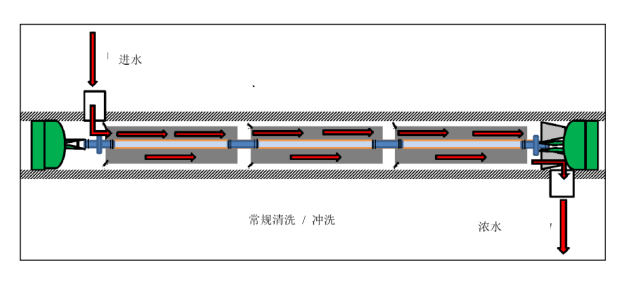 反滲透膜清洗系統(tǒng)常規(guī)設(shè)計(jì)是清洗液從壓力容器進(jìn)水端流入,經(jīng)過膜元件后從壓力容器濃水端流出。這個(gè)流向與 RO 系統(tǒng)正常運(yùn)行時(shí)是一樣的。這種清洗方式通常是常見且有效的。