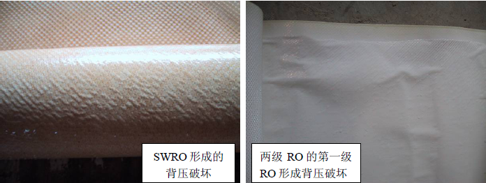 反滲透產(chǎn)水背壓是指反滲透產(chǎn)水靜態(tài)壓力大于給水或濃水靜態(tài)壓力,背壓損壞是反滲透膜元件使用中常見的故障之一,產(chǎn)水背壓會會導(dǎo)致產(chǎn)水從膜的產(chǎn)水側(cè)壓入進(jìn)水側(cè),從而導(dǎo)致反滲透膜進(jìn)水側(cè)、最外側(cè)和濃水側(cè)這三處粘接密封線附近破裂,進(jìn)水網(wǎng)格的小格內(nèi)出現(xiàn)氣泡狀剝離。在反滲透膜表面上的破壞形態(tài)看起來像鼓泡,沿著進(jìn)水隔網(wǎng)有規(guī)律地分布,鼓泡的部位其微觀結(jié)構(gòu)已經(jīng)破壞,孔徑變大,透鹽增加,導(dǎo)致反滲透系統(tǒng)脫鹽率下降。對膠線破壞后會導(dǎo)致給水側(cè)/濃水側(cè)高電導(dǎo)率的水漏入產(chǎn)水中導(dǎo)致反滲透系統(tǒng)脫鹽率下降。因此,任何時(shí)候都要避免產(chǎn)品水側(cè)產(chǎn)生背壓,產(chǎn)水壓力不得高于進(jìn)水或濃水0.3bar。