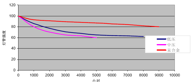 紫外線殺菌器是純水系統(tǒng)一種常用的對(duì)水體進(jìn)行殺菌消毒的設(shè)備,紫外線燈管的使用壽命不是指燈管熄滅的時(shí)間,而是指燈管的發(fā)光效率低于消毒殺菌所需要的有效值,無法提供足夠的紫外線輻射量,從而影響殺菌消毒的效果。影響燈管使用壽命的主要原因是燈管內(nèi)部的汞會(huì)慢慢釋放到燈管內(nèi)壁,因此會(huì)逐步影響燈管的紫外線強(qiáng)度。為了保證紫外線殺菌器的殺菌效果,必須定期更換紫外線燈管。各類燈管使用壽命如下圖:
