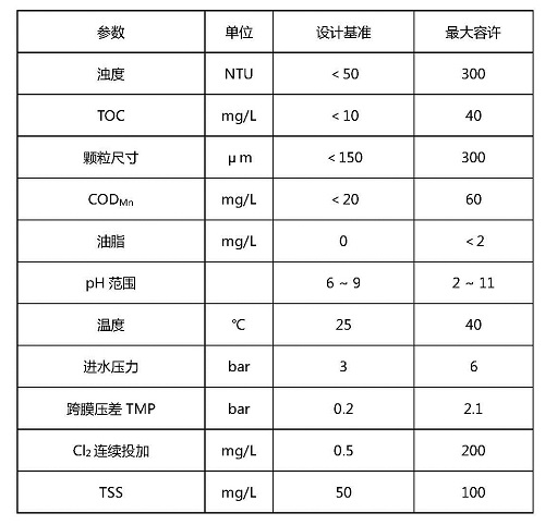 為了維持超濾膜性能的穩(wěn)定,尤其是保持超濾膜透水速率的相對穩(wěn)定,需要對超濾膜進水水質(zhì)進行限定或考慮適當(dāng)?shù)念A(yù)處理,以避免這些雜質(zhì)含量過高而對超濾膜組件造成嚴重的膜污染。超濾膜的設(shè)計是基于如下表中所示的合格進水條件,但超濾膜可以短時間內(nèi)承受最大允許進水水質(zhì)。