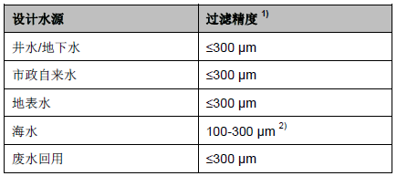 注:1)實際項目的過濾精度根據(jù)具體水質(zhì)條件和項目的具體要求確定;