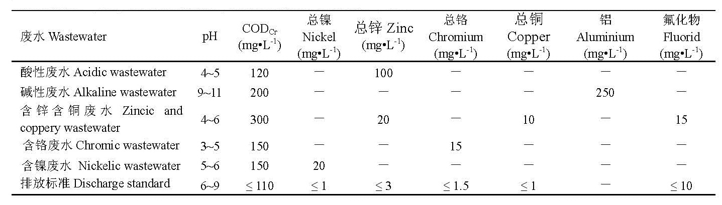 鋁合金輪轂生產(chǎn)廢水主要來源于輪轂涂裝堿洗工序的堿性廢水和電鍍生產(chǎn)線的酸性廢水、含鋅含銅廢水、含鉻廢水和含鎳廢水。各種類型廢水的主要污染物濃度如表 1所示。
