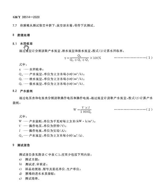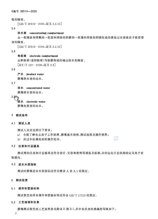 《電去離子膜堆測試方法》GB/T 38514-2020于近日發(fā)布,2021年2月1日起施行。